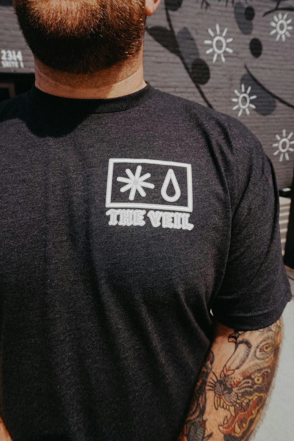 Heather black tee with Veil Made Me Do It design by Tim Skirven. Made with recycled materials and packaged in a compostable bag. Recycle or Die!