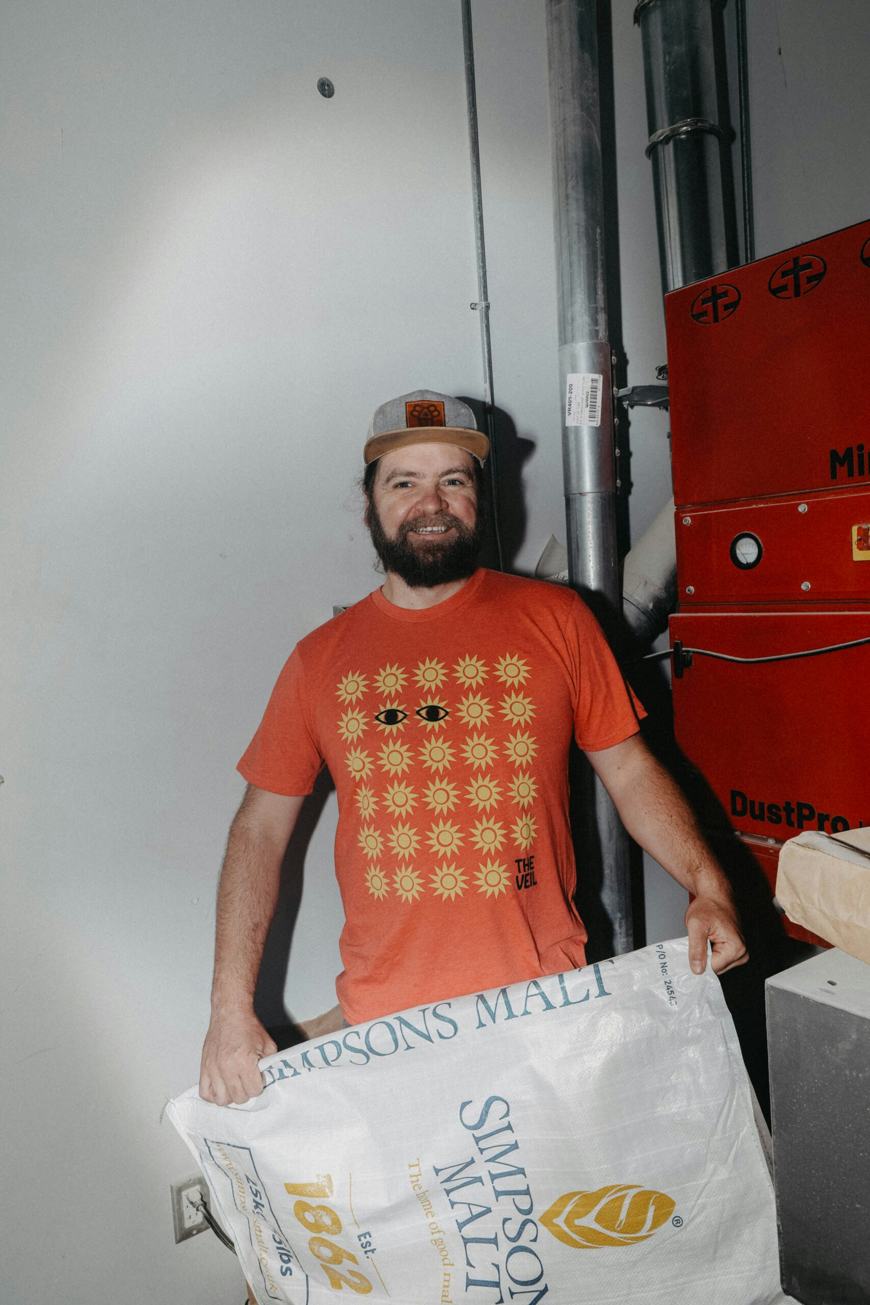 Heather red shirt with yellow and black sunshine design by Tim Skirven! Made from organic, recycled cotton.